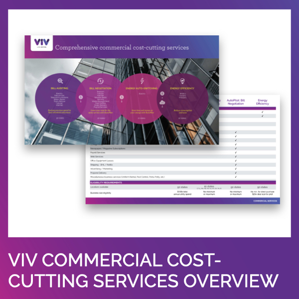 Viv works for your business to improve the bottom line with a full suite of comprehensive cost-cutting services. The goal is to help reduce operating expenses on critical services that you need, without changing providers or any aspects of the services that you depend on. Our services offer no-risk, no-obligation opportunities to save on costs such as electricity, telecom, utility services and much more. Here at Viv, we pride ourselves in saving you the hassle, time and money so you can focus on what matters most for your business.
